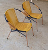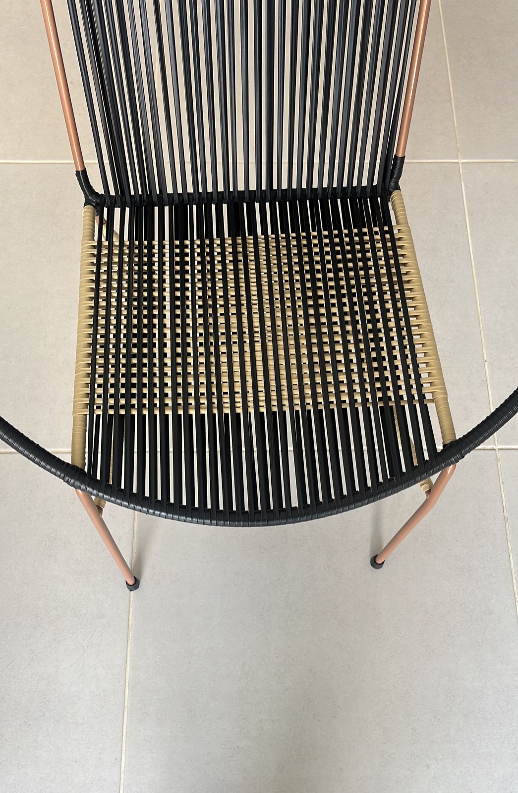 Silla fabricada en fibra de PVC y estructura en hierro, 100% tejida artesanalmente con un diseño en forma de medialuna que aporta frescura y un toque distintivo a cualquier ambiente.