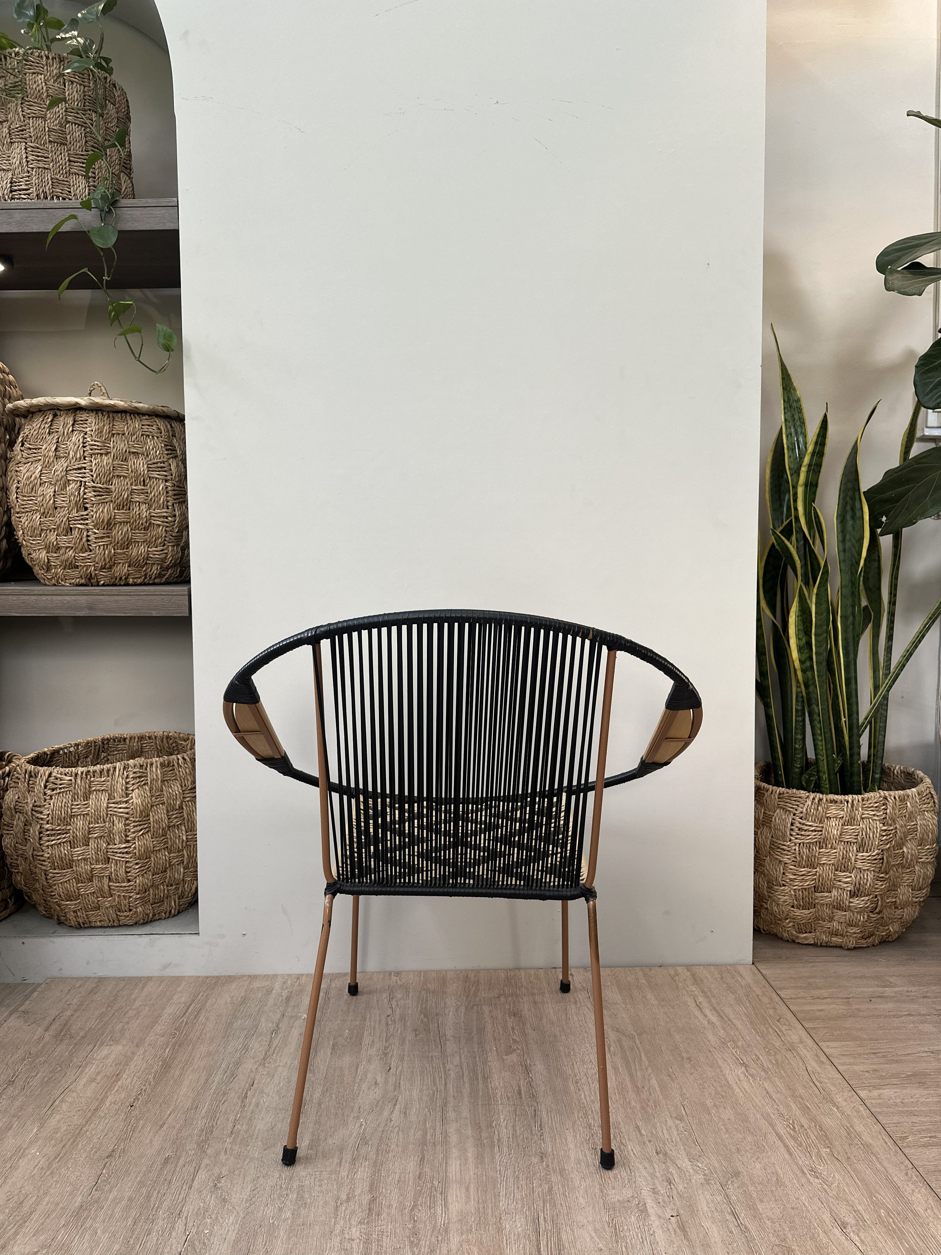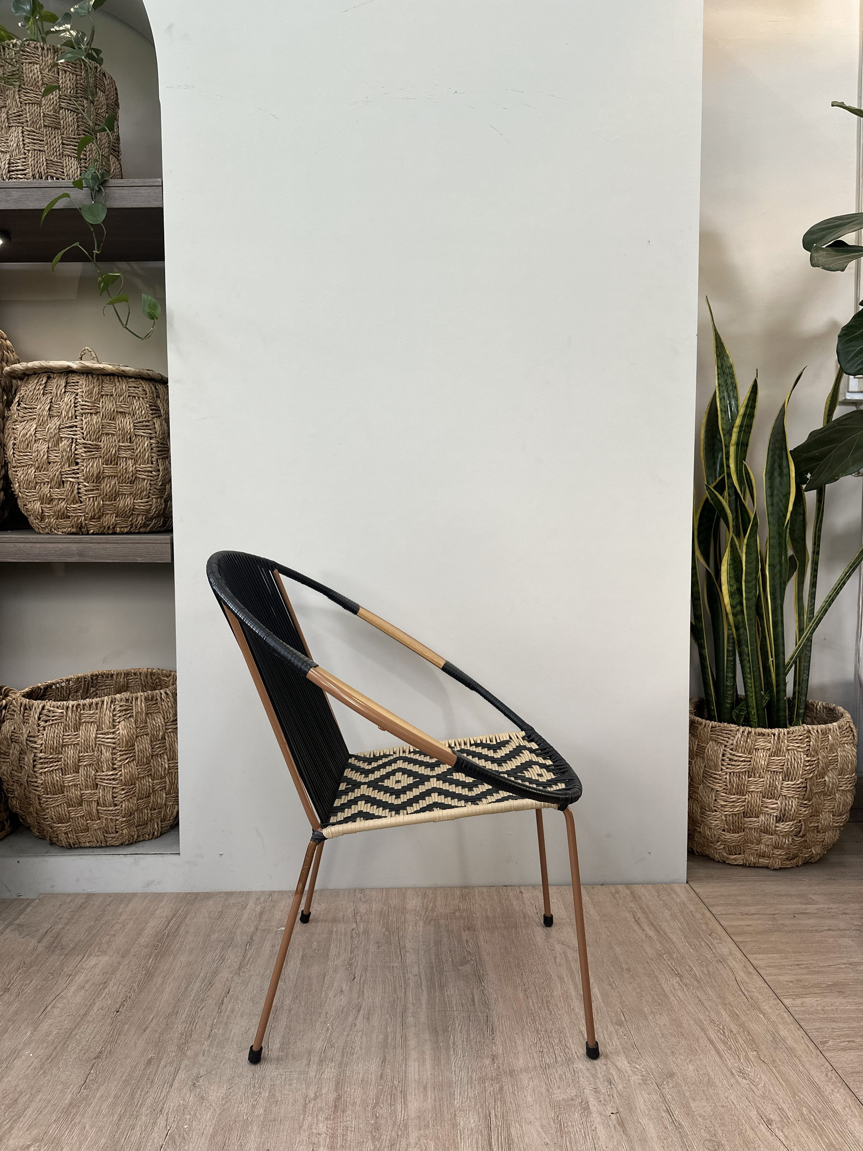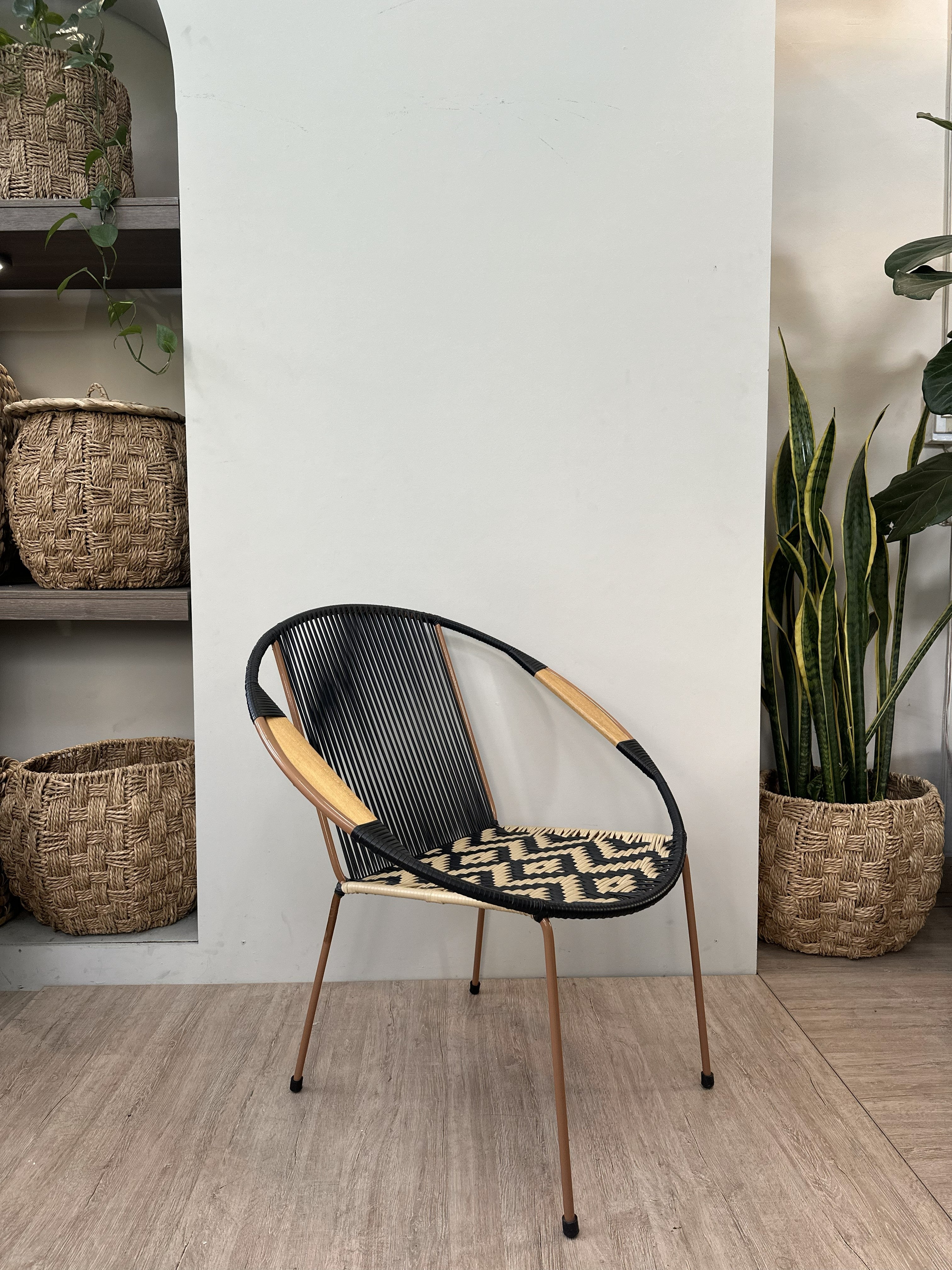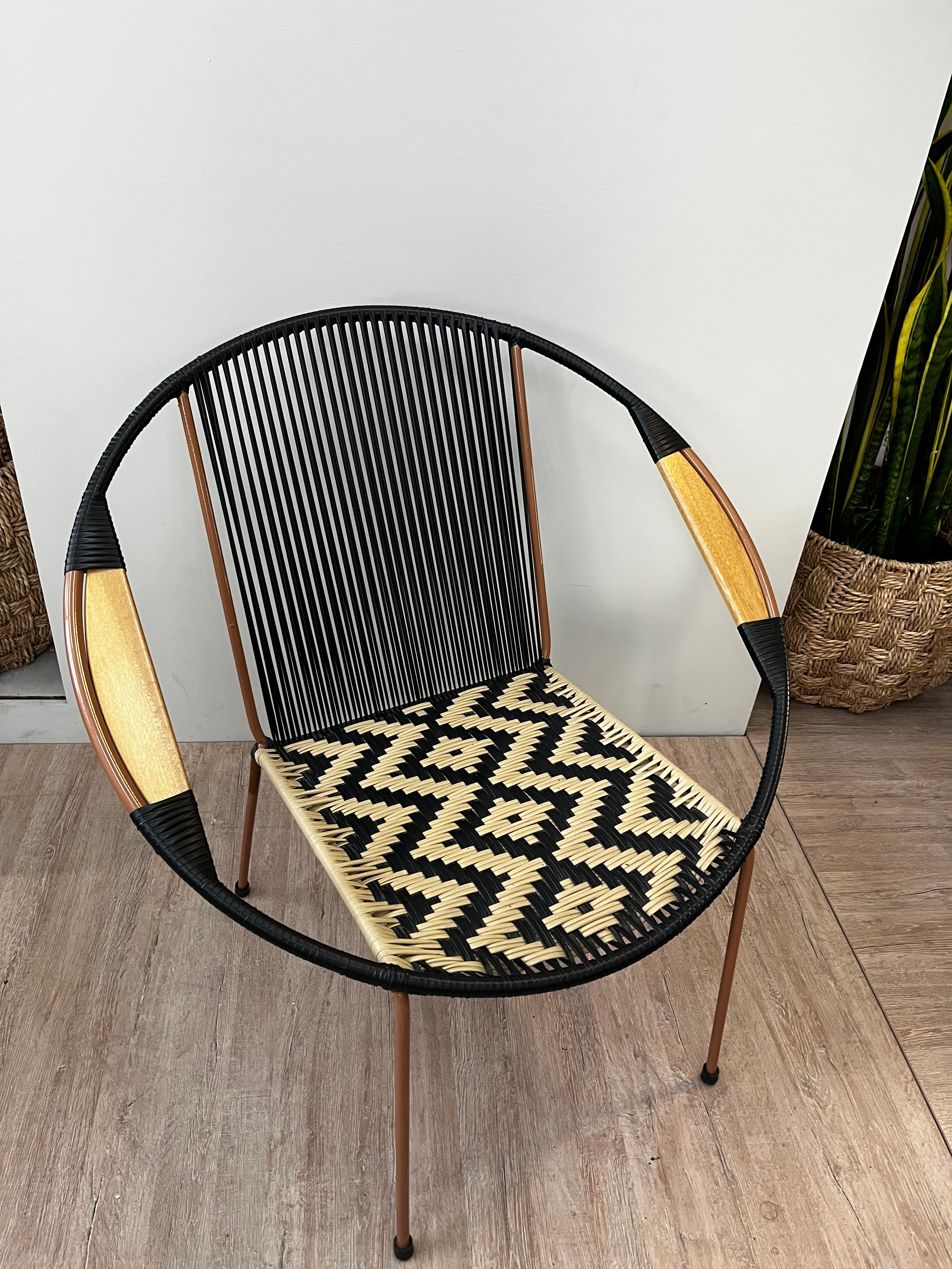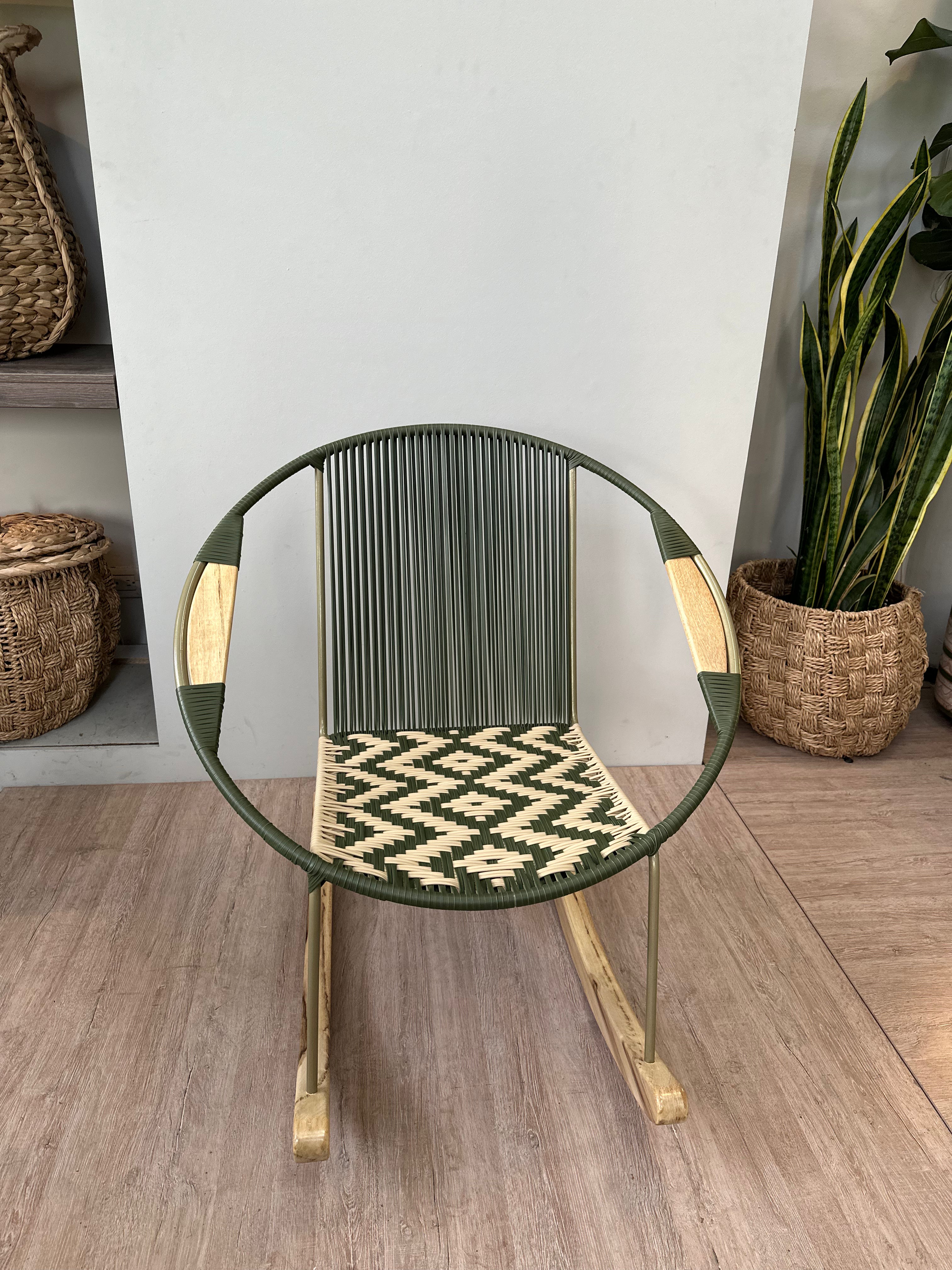 Silla fabricada en fibra de PVC y estructura en hierro, 100% tejida artesanalmente con un diseño en forma de medialuna que aporta frescura y un toque distintivo a cualquier ambiente. Su tejido adaptable y su amplia paleta de colores permiten personalizarla según tu estilo, logrando una pieza única que realza tus espacios. Puedes elegir que sea mecedora o tambien en su version estática.